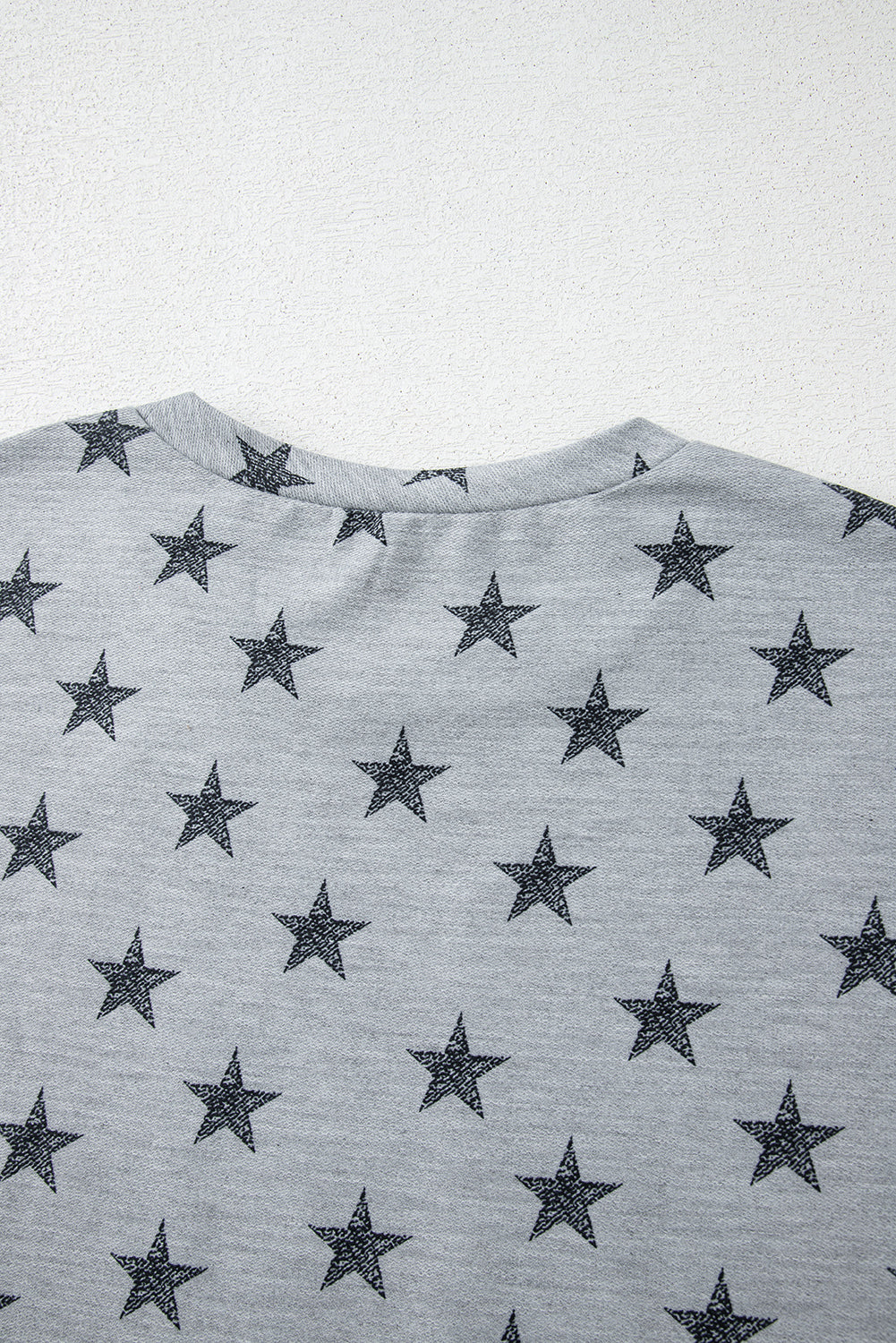 • Gray Star Print Tiered Ruffle Sleeve Crew Neck T Shirt