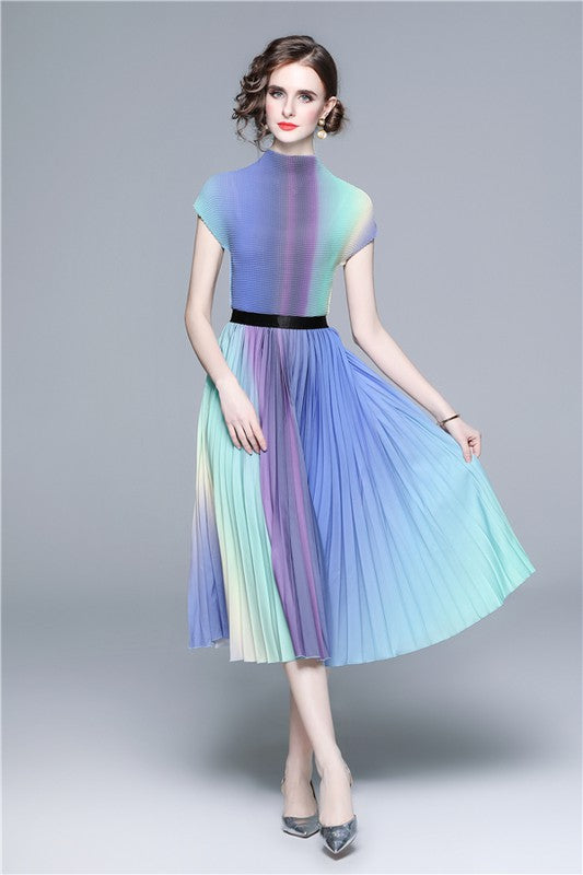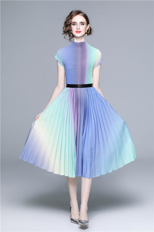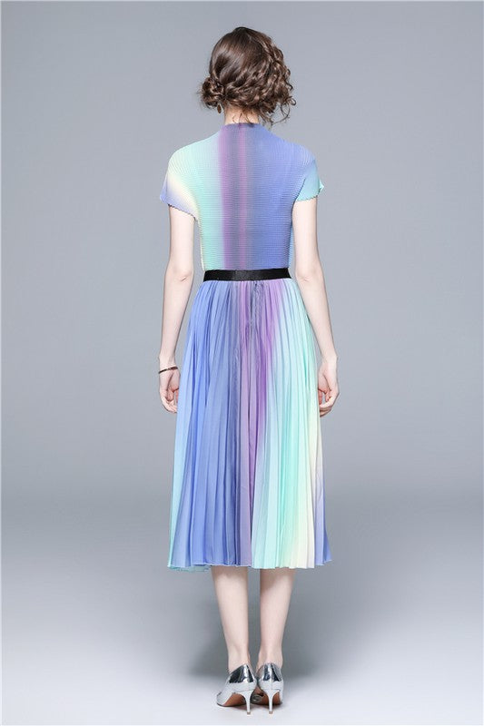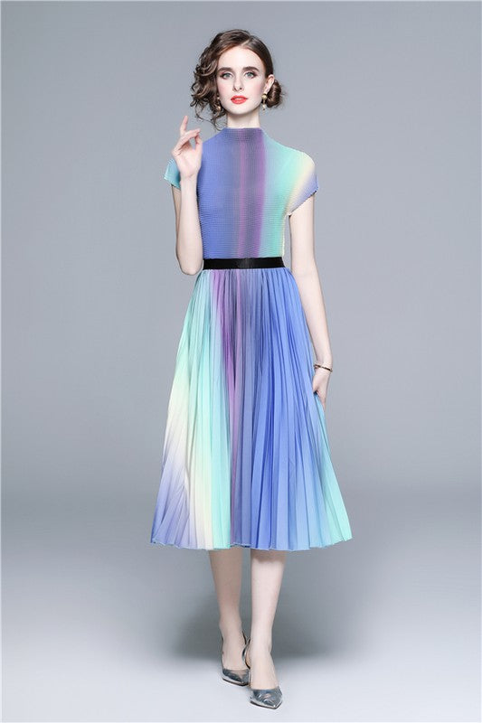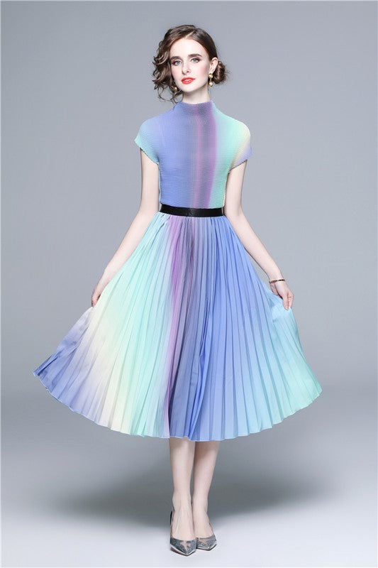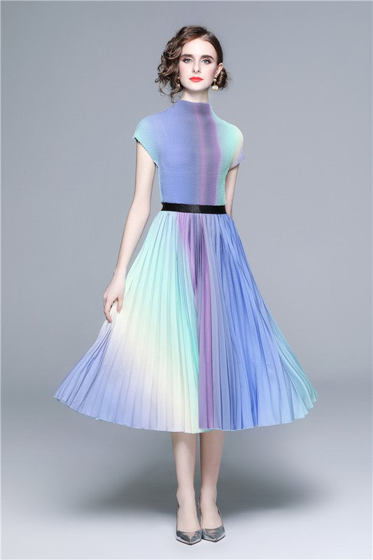 Details-multi print, round neckline, short sleeves, elasticized waist, top and skirt